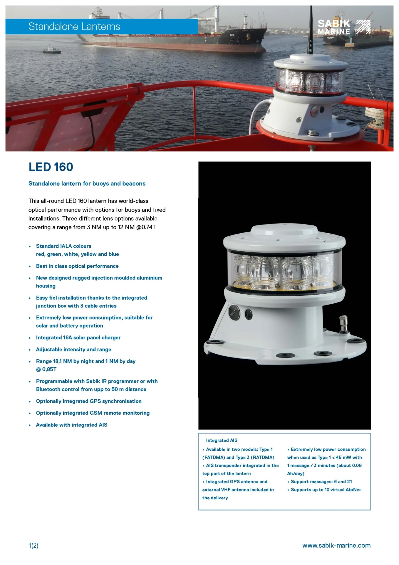 This all-round LED 160 Marine Lantern has world-class optical performance with options for buoys and fixed installations. Three different lens options available covering a range from 3 NM up to 12NM (Tc = 0,74).