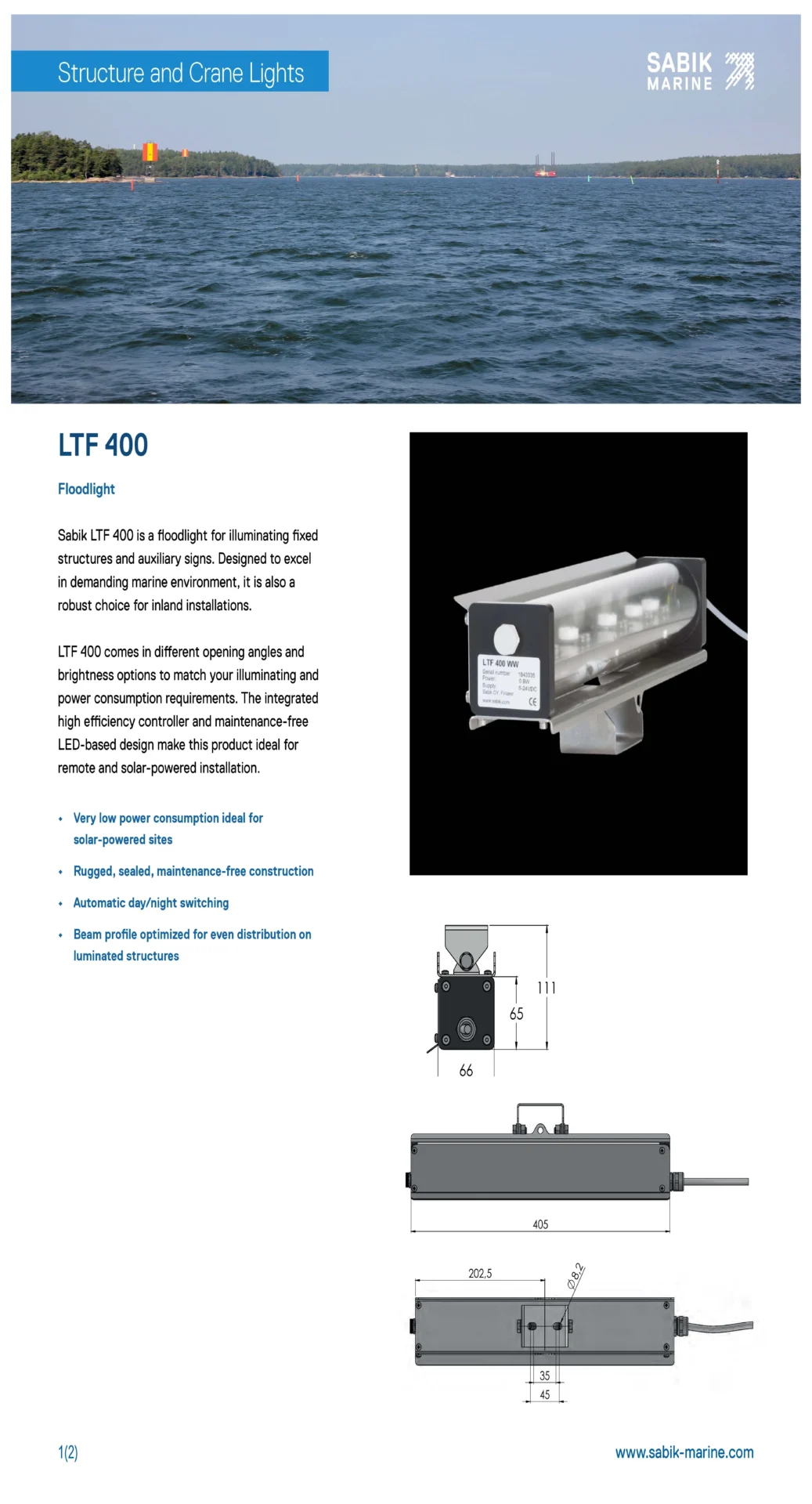 The Sabik LTF 400 is a floodlight designed to illuminate fixed structures and auxiliary signs, excelling in the demanding marine environment and robust enough for inland installations. The LTF 400 offers various opening angles and brightness options to meet your specific illumination and power consumption needs. Its integrated high-efficiency controller and maintenance-free LED-based design make this product ideal for remote and solar-powered installations, ensuring reliable performance in diverse settings.