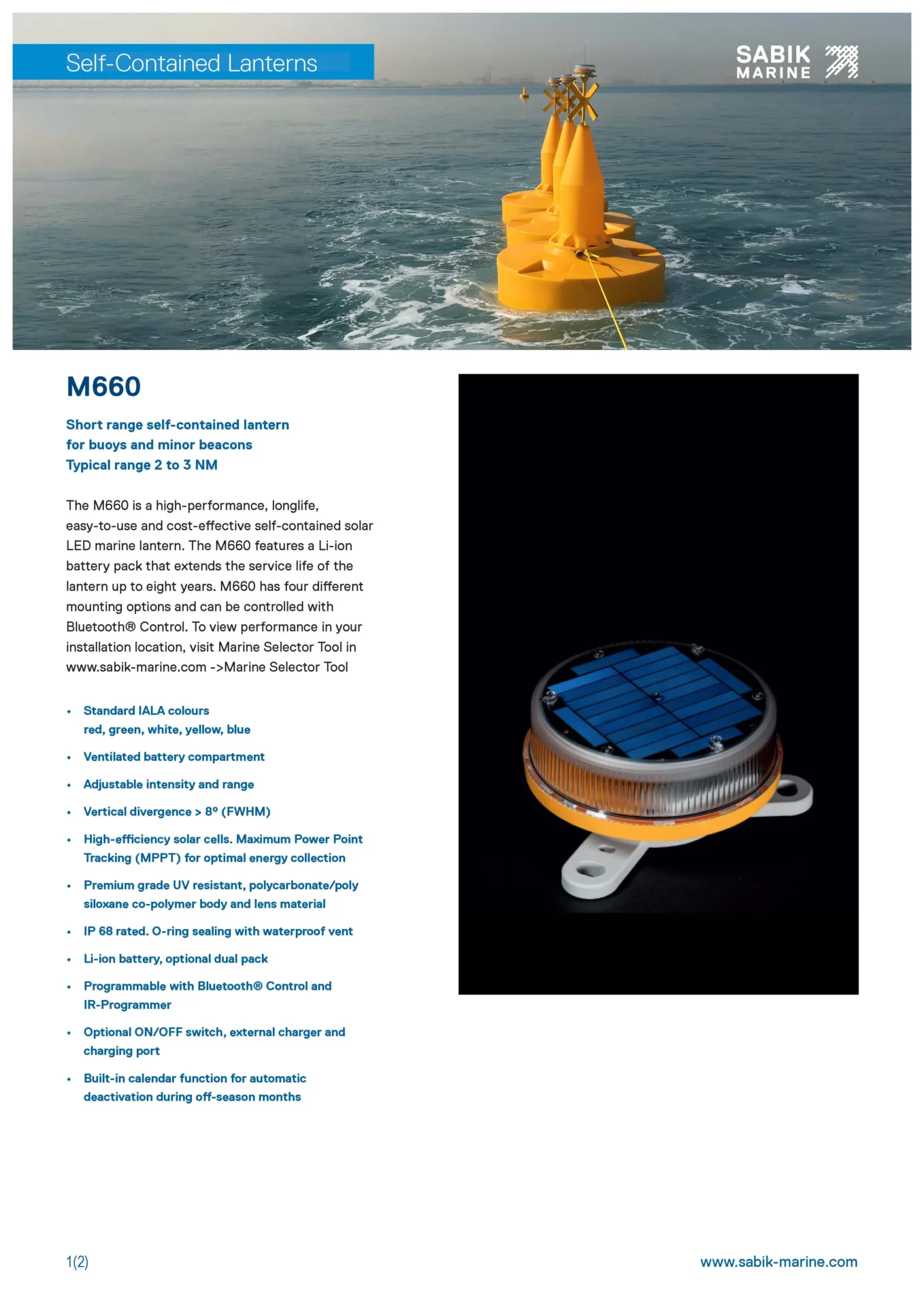 Self-contained LED lantern for buoys and minor beacons, up to 4 NM range. The M660 is a high-performance, long life, easy-to-use and cost effective self-contained solar LED marine lantern. The M660 features a Li-ion battery pack that extends the service life of the lantern up to eight years. M660 has four different mounting options and can be controlled with Bluetooth® Control.