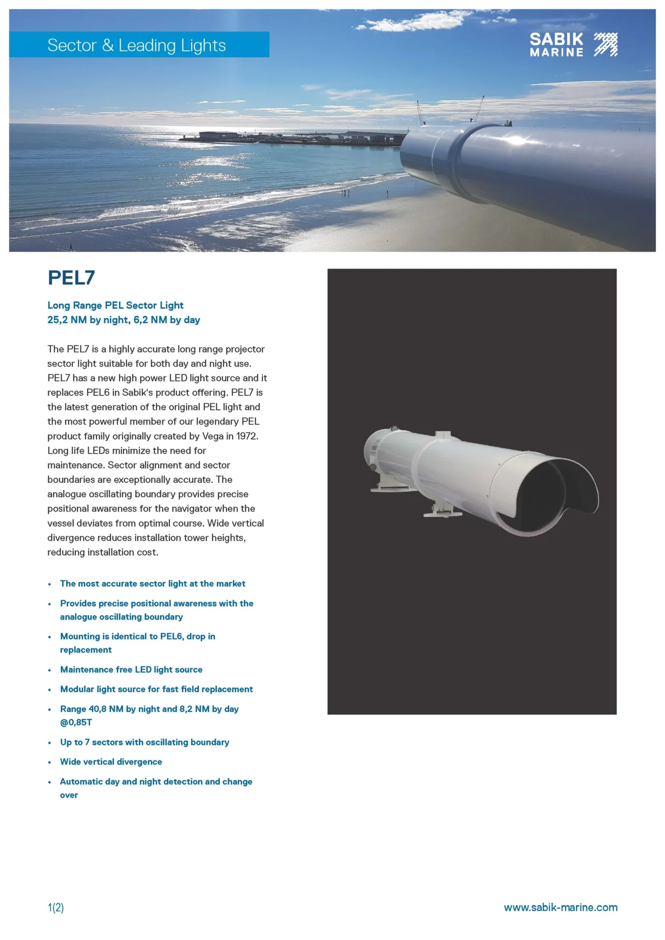 The PEL-7 is a highly accurate long range projector sector light suitable for both day and night use. PEL-7 has a new high power LED light source and it replaces PEL-6 in Sabik‘s product offering. PEL-7 is the latest generation of the original PEL light and the most powerful member of our legendary PEL product family originally created by Vega in 1972. Long life LEDs minimize the need for maintenance. Sector alignment and sector boundaries are exceptionally accurate. The analogue oscillating boundary provides precise positional awareness for the navigator when the vessel deviates from optimal course. Wide vertical divergence reduces installation tower heights, reducing installation cost.