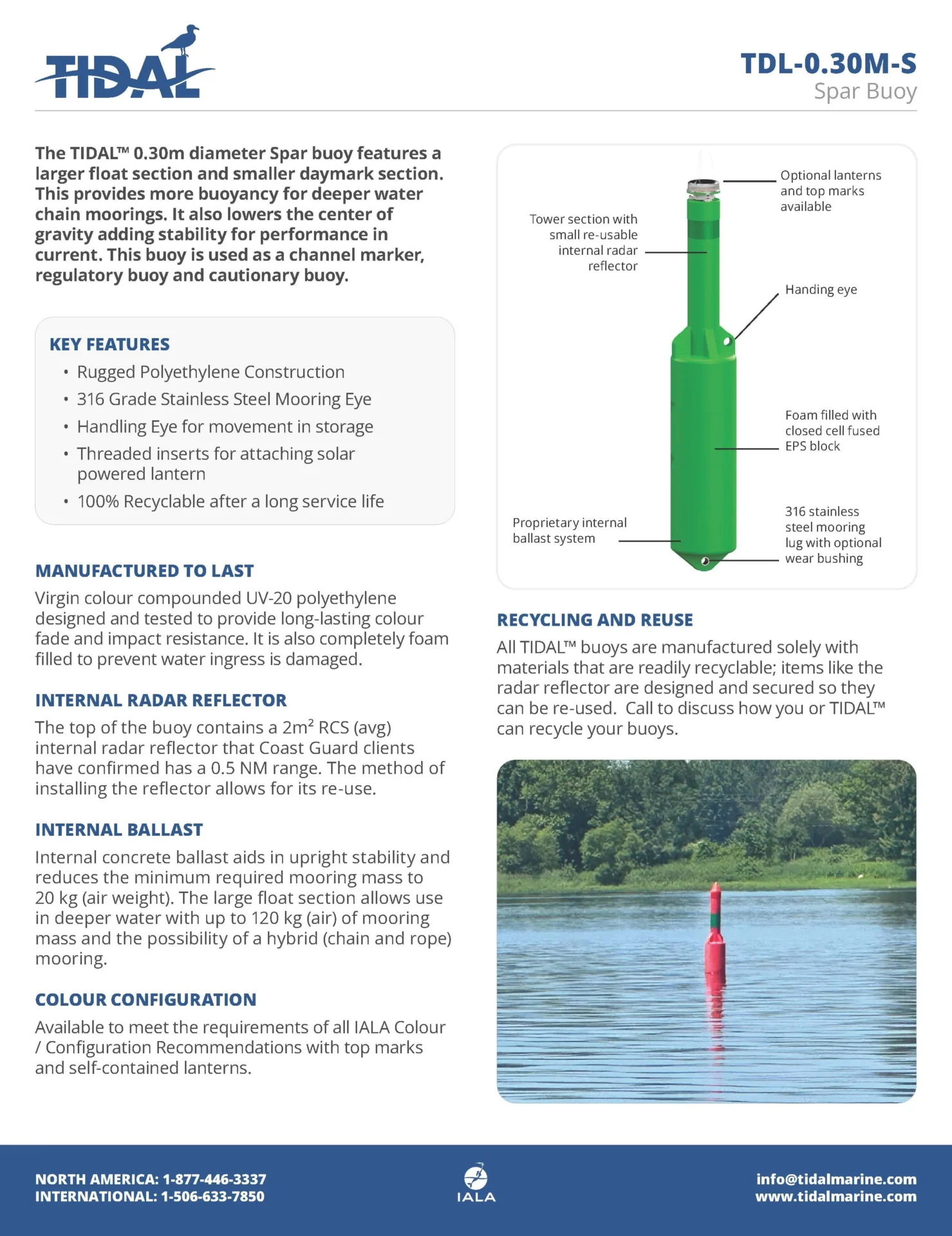 The TIDAL™ 0.30m diameter Spar buoy features a larger float section and smaller daymark section. This provides more buoyancy for deeper water chain moorings. It also lowers the center of gravity adding stability for performance in current. This buoy is used as a channel marker, regulatory buoy and cautionary buoy.