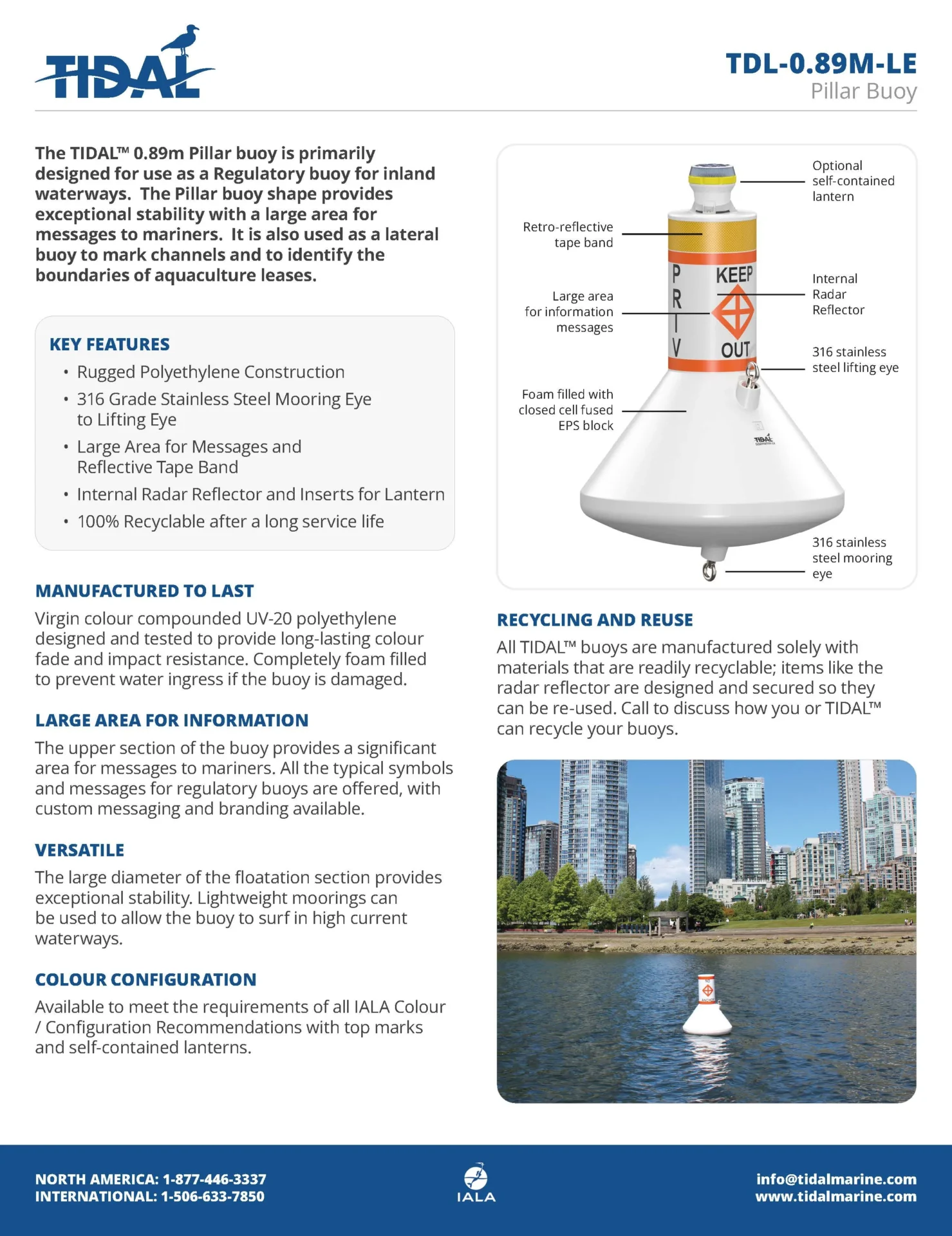 The TIDAL™ 0.89m Pillar buoy is primarily designed for use as a Regulatory buoy for inland waterways. The Pillar buoy shape provides exceptional stability with a large area for messages to mariners. It is also used as a lateral buoy to mark channels and to identify the boundaries of aquaculture leases.The TIDAL™ 0.89m Pillar buoy is primarily designed for use as a Regulatory buoy for inland waterways. The Pillar buoy shape provides exceptional stability with a large area for messages to mariners. It is also used as a lateral buoy to mark channels and to identify the boundaries of aquaculture leases.