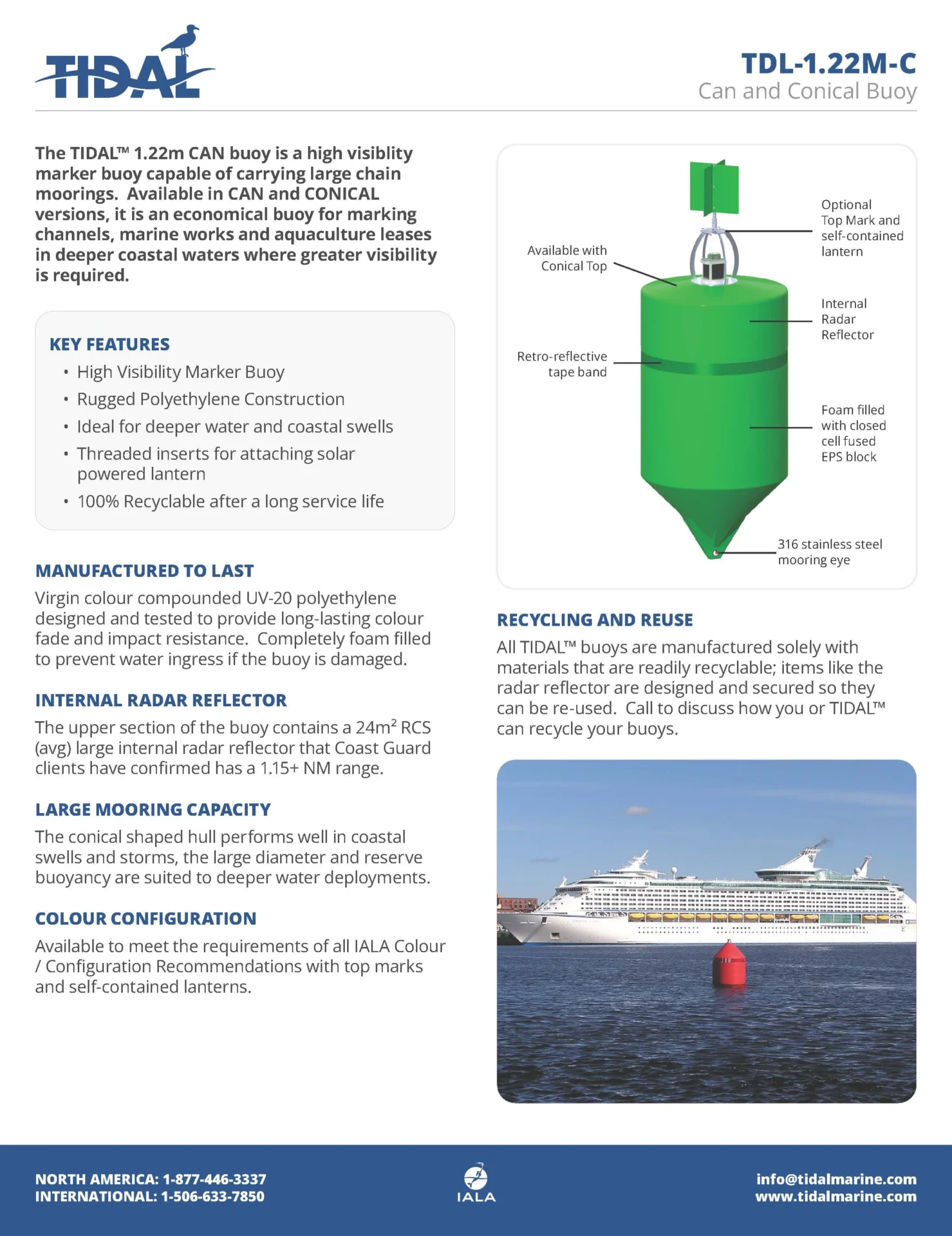 The TIDAL™ 1.22m CAN buoy is a high visibility marker buoy capable of carrying large chain moorings. Available in CAN and CONICAL versions, it is an economical buoy for marking channels, marine works and aquaculture leases in deeper coastal waters where greater visibility is required.