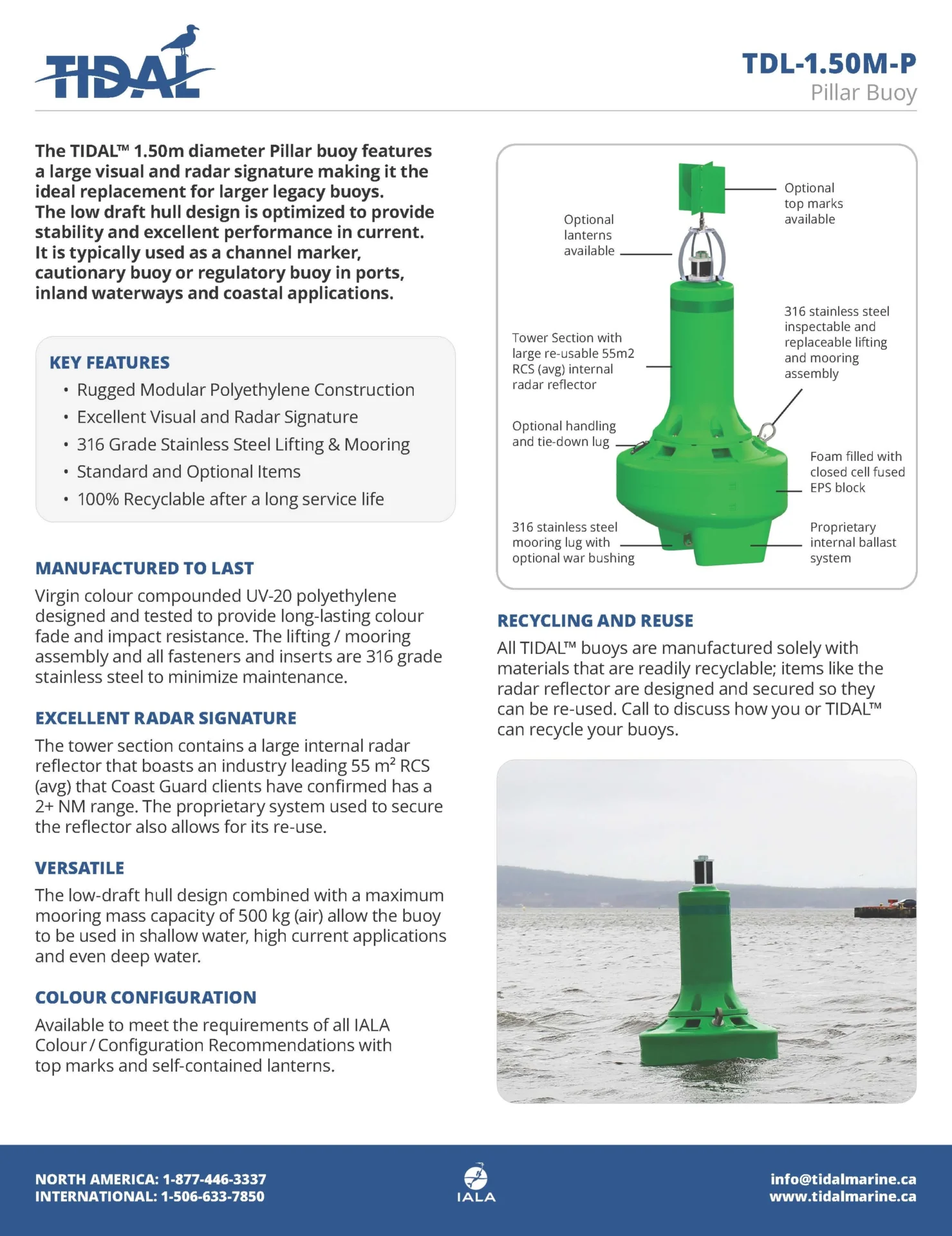 The TIDAL™ 1.50m diameter Pillar buoy features a large visual and radar signature making it the ideal replacement for larger legacy buoys. The low draft hull design is optimized to provide stability and excellent performance in current. It is typically used as a channel marker, cautionary buoy or regulatory buoy in ports, inland waterways and coastal applications.
