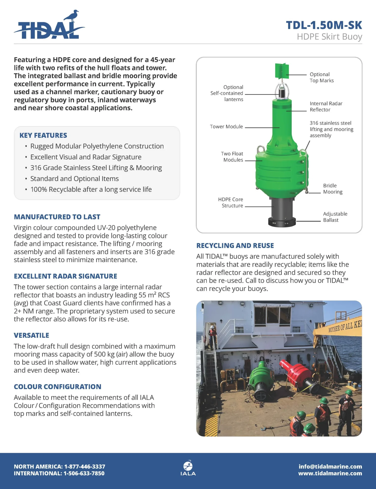 Featuring a HDPE core and designed for a 45-year life with two refits of the hull floats and tower. The integrated ballast and bridle mooring provide excellent performance in current. Typically used as a channel marker, cautionary buoy or regulatory buoy in ports, inland waterways and near shore coastal applications.