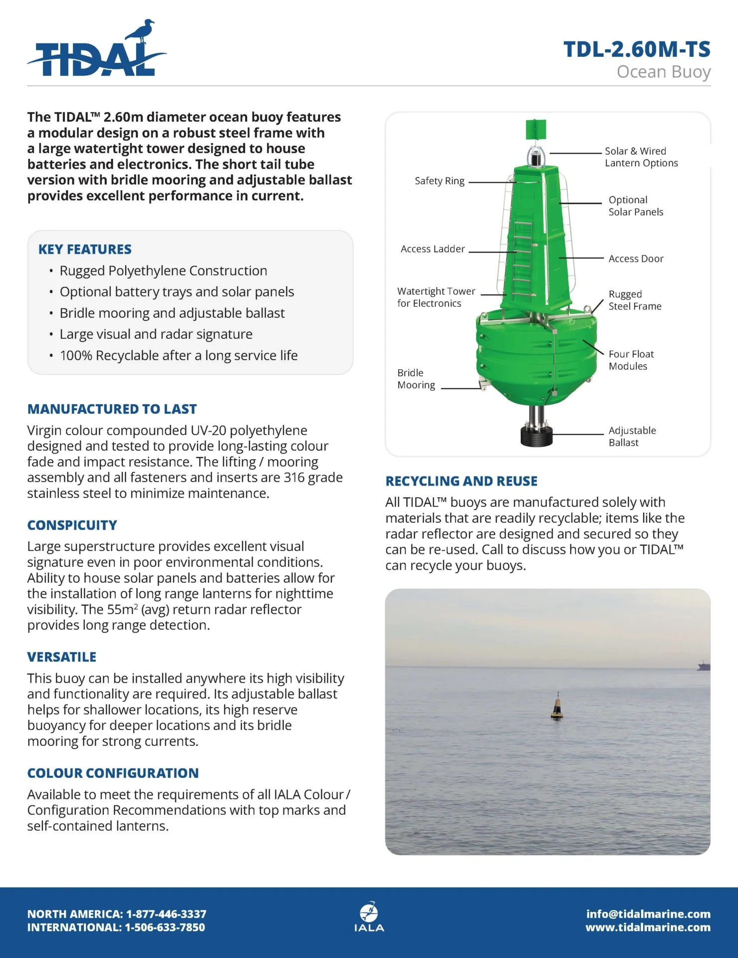 The TIDAL™ 2.60m diameter ocean buoy features a modular design on a robust steel frame with a large watertight tower designed to house batteries and electronics. The short tail tube version with bridle mooring and adjustable ballast provides excellent performance in current.